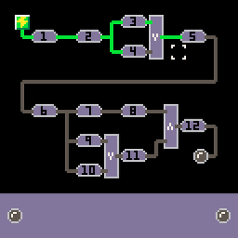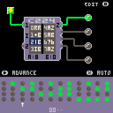 You are presented with the C224, a processor with two inputs and four outputs. It has enough internal memory to store eight instructions, each chosen from among sixteen options: “RR”, “AB”, “IB”, “AZ”, “+B”, “&B”, “|B”, “^B”, “J0”, “J2”, “J4”, “J6”, “?0”, “?2”, “?4”, or “?6”. Your goal is to figure out what these instructions do, then use this knowledge to solve puzzles, where both output and timing are important.